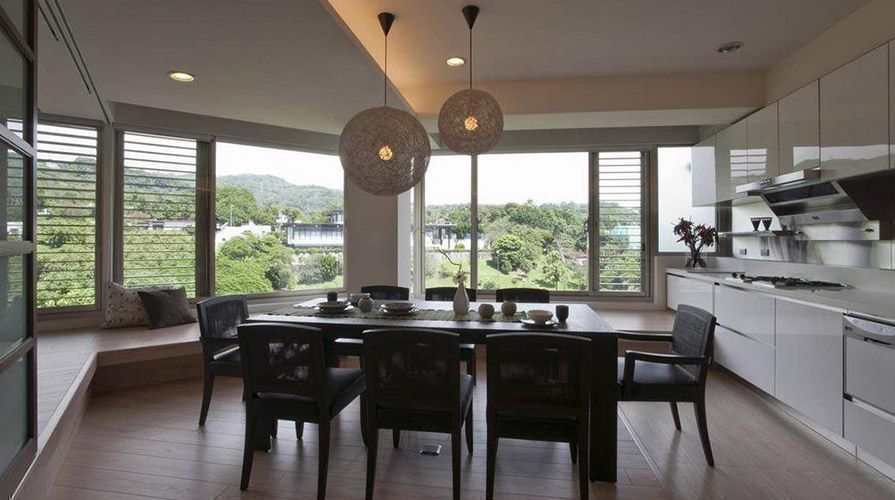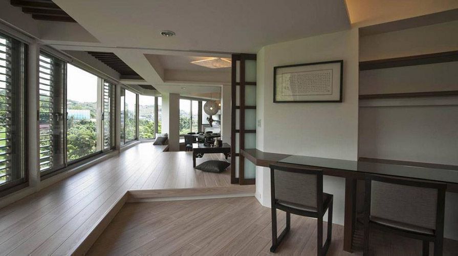 • 擁有絕佳美景的扇形屋,沿著屋廓有一整排的綠海對外窗,卻礙于原始包廂式的格局,將日光綠景拒于窗外。擅長以動線調(diào)整,擘畫家完美樣貌的將作設(shè)計(jì),重新布局空間格局的對等關(guān)系,引進(jìn)光與景,讓每一個(gè)空間都能感受來自大自然的恩典。 將作設(shè)計(jì)位移餐廚區(qū)至臨窗采光區(qū),以日式緣廊為概念,沿著屋廓架高平臺,連接廚房、餐廳、和室與小孩房,打造綠光散步廊道,不僅擴(kuò)增餐廳的使用機(jī)能,可自由貫穿的動線鋪排,完整了遠(yuǎn)眺的視野,連心胸也跟著開闊。